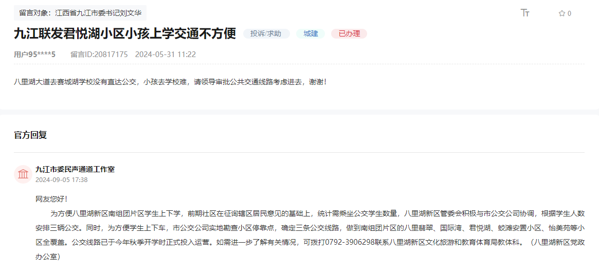 關于反映九江市八里湖新區聯發君悅湖等多個小區學生上學交通不便的問題。經九江市八里湖新區黨工委核辦,新區管委會在征詢居民意見的基礎上,協調市公交公司開通了3條公交線路,2024年秋季開學時已正式投入運營,有效覆蓋了蛟灘安置小區和聯發君悅湖、怡美苑等多個小區。