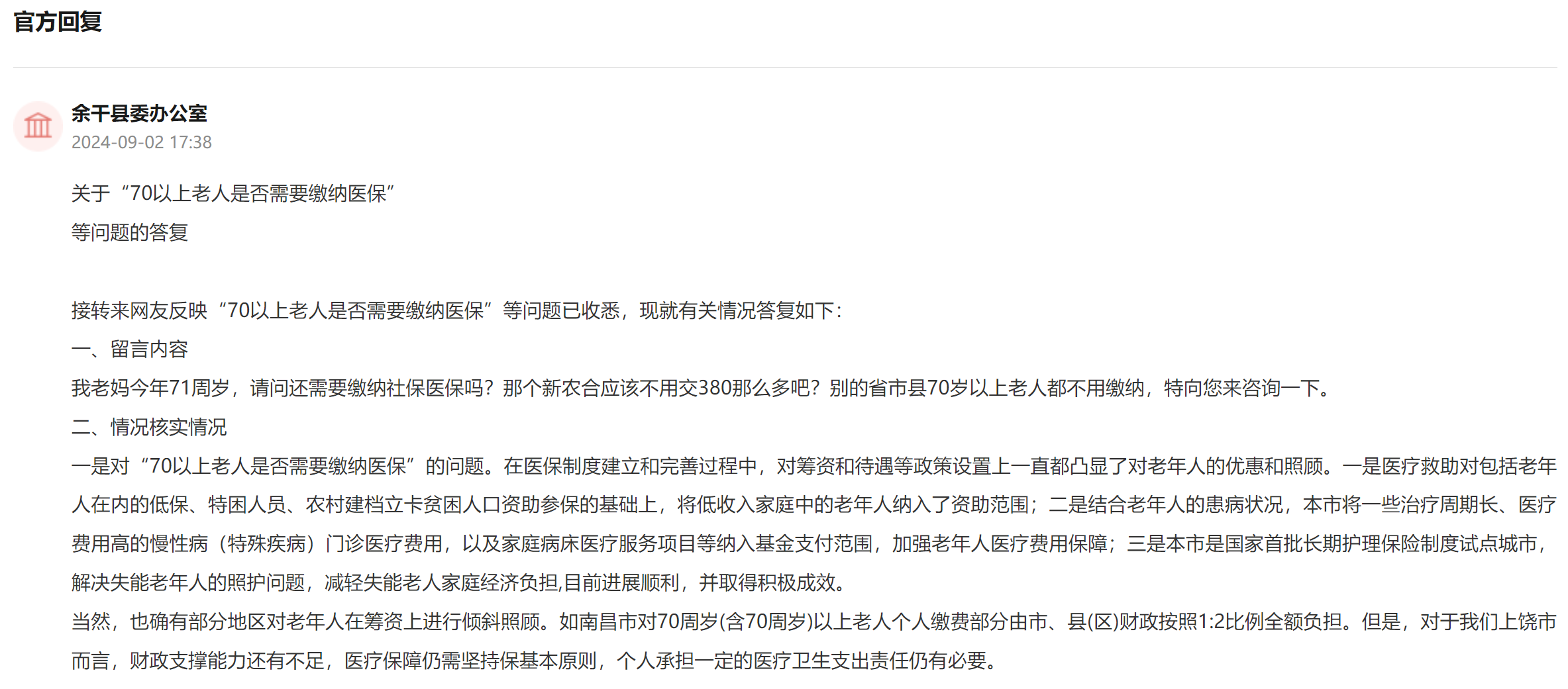 “我老媽今年71周歲,請問還需要繳納社保醫保嗎?”近日,網友向上饒市余干縣委書記咨詢。【留言地址】