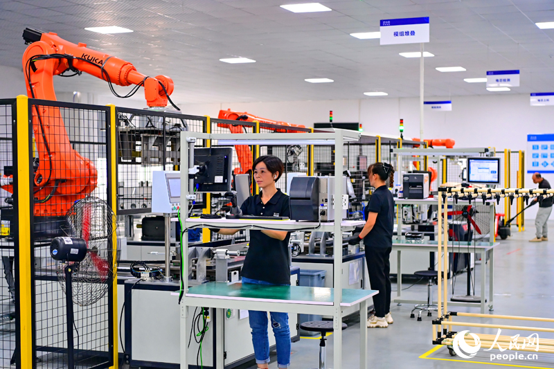 撫州市南豐縣智能制造產業園卓陽江西智能工廠,工人在智能化生產車間裝配儲能電池。人民網 朱海鵬攝