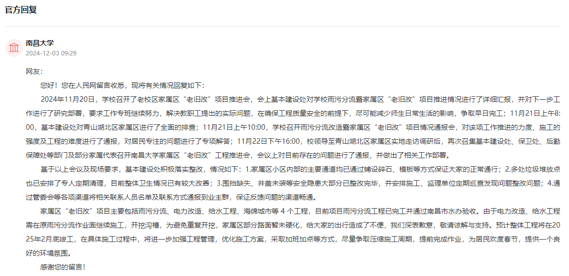 收到網友留言后,南昌大學召開了老校區家屬區“老舊改”項目推進會,會上基本建設處對學校雨污分流暨家屬區“老舊改”項目推進情況進行了詳細匯報,并積極落實整改。