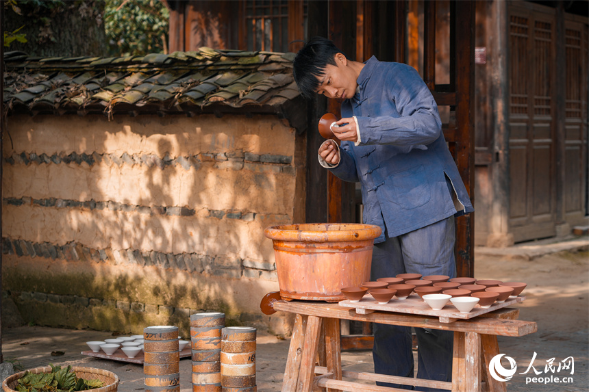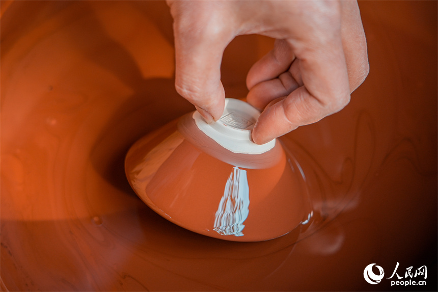 在吉州窯古陶瓷研究所作坊內,工匠正在給瓷坯上釉。