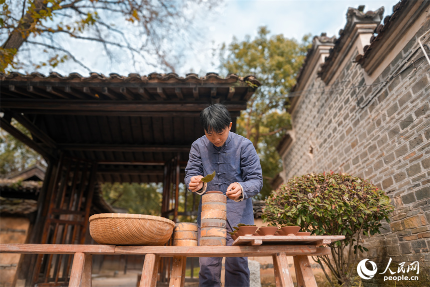 工匠將一片片桑葉放入上完釉的瓷坯中。
