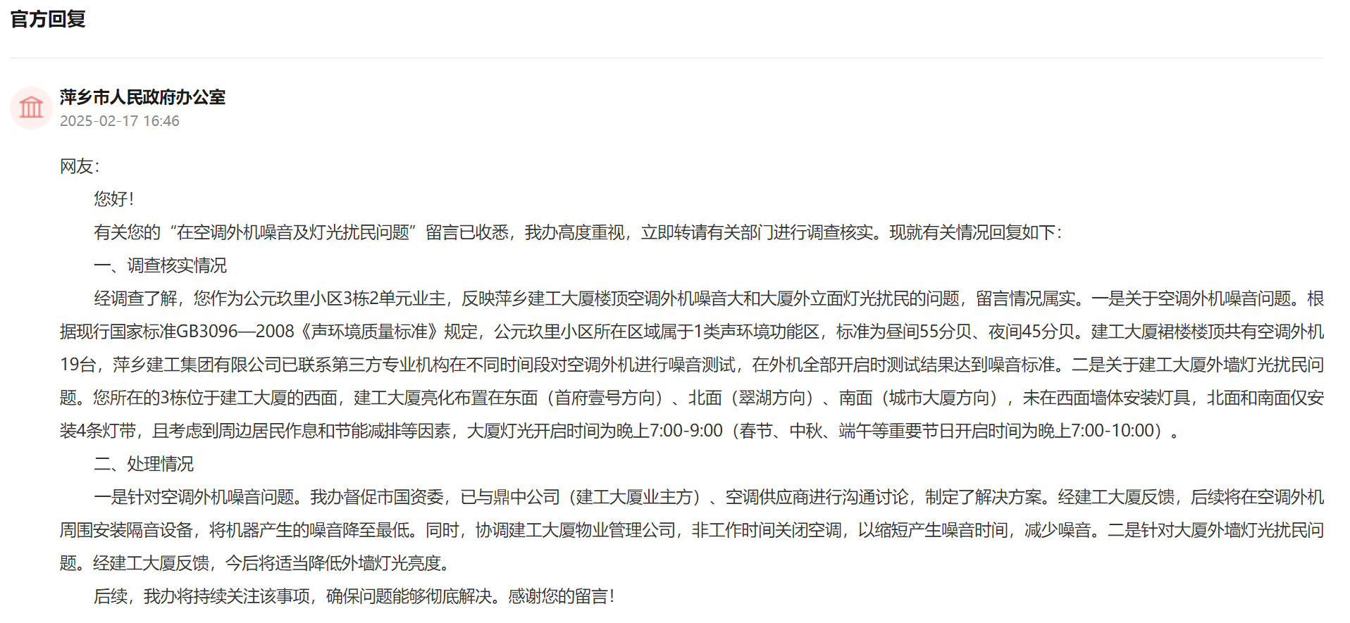 針對空調外機噪音問題。萍鄉市人民政府辦公室督促市國資委,已與鼎中公司(建工大廈業主方)、空調供應商進行溝通討論,制定了解決方案。經建工大廈反饋,后續將在空調外機周圍安裝隔音設備,將機器產生的噪音降至最低。同時,非工作時間關閉空調,以縮短產生噪音時間,減少噪音。