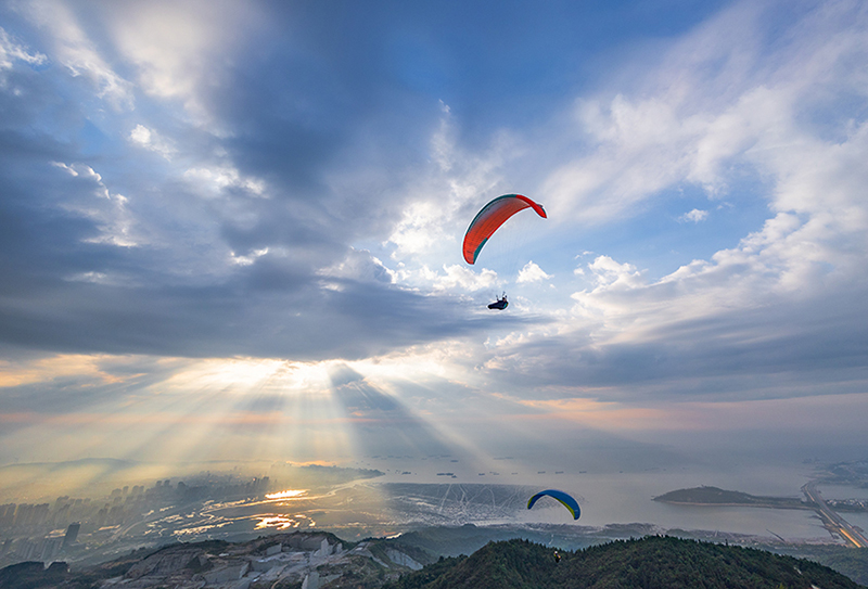 “助跑、騰空、飛翔!”在專業教練的指導下,來自武漢的游客孫?與家人借助滑翔傘上完成了一次“與云并肩”的奇妙旅程。