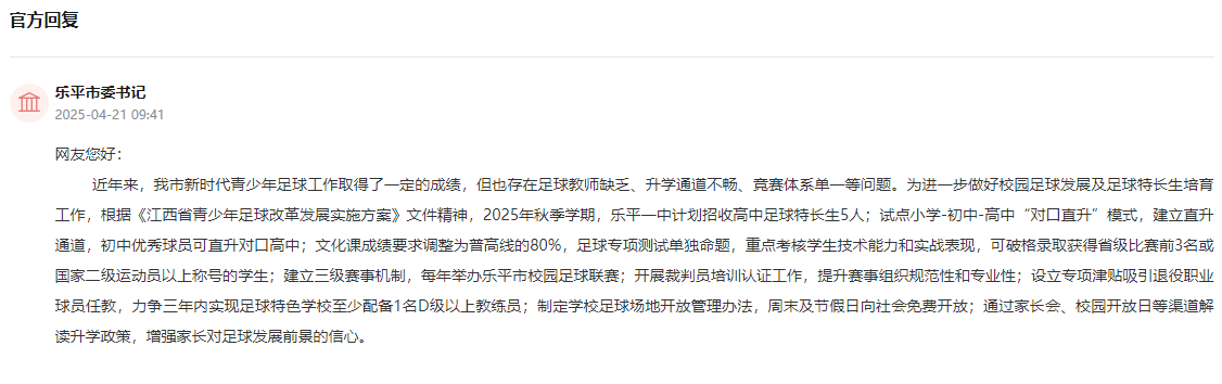 收到網友留言后,樂平市委書記進行了回復。近年來,樂平市新時代青少年足球工作取得了一定的成績,但也存在足球教師缺乏、升學通道不暢、競賽體系單一等問題。