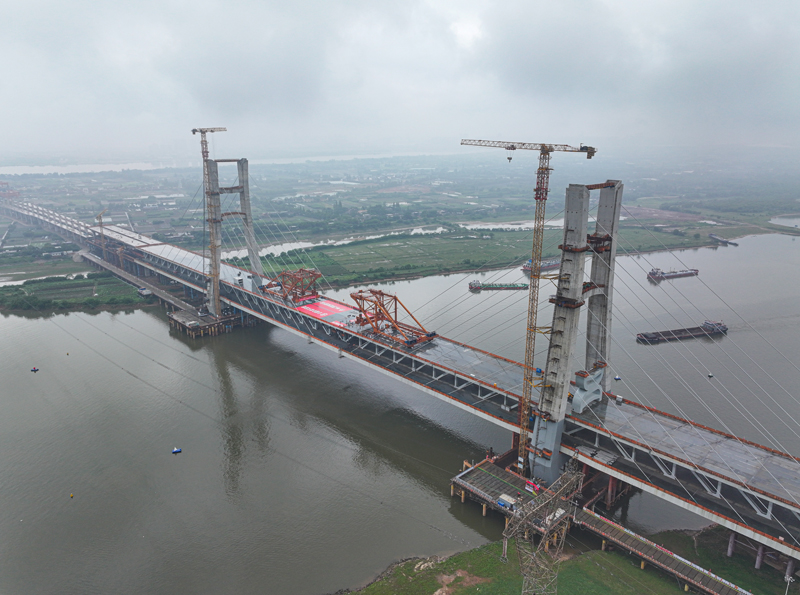 據了解,隆興大橋西支主橋鋼梁架設,采用先邊跨后中跨的施工工藝,首先完成兩側邊跨鋼梁頂推作業,待邊跨精準就位后,再以南北兩座主塔為基點向中跨方向同步展開懸臂架設,最后通過雙向對向施工實現中跨合龍口毫米級精準對接。其中,在結構復合性方面,開創性打造了全球首座集12車道公路與高鐵軌道于一體的復合型橋梁,其公路通行能力較常規橋梁提升50%,高鐵軌道設計時速350公里。在工程技術方面,創造了320米無砟軌道斜拉橋世界最大跨徑紀錄;在設計理念方面,首創豎琴形索面斜拉布局,首次在斜拉橋中采用彈性約束支座系統,同時還創了鐵路橋梁斜拉索直徑之最,形成具有自主知識產權的技術體系;在構造形式方面,創新采用大挑臂斷面鋼桁梁結構,實現了受力性能與建筑美學的有機統一。