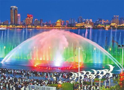近年來,南昌市推出特色美食、文化演藝、旅游觀光等多元化夜間經濟消費新場景、新業態,傾力打造一張張“夜經濟”名片。圖為6月20日,南昌市秋水廣場,噴泉隨著音樂的旋律起舞,為市民和游客奉上一場視覺與聽覺的盛宴。(記者 吳文兵攝)