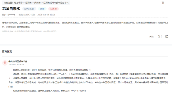 關于反映撫州市臨川區龍溪鎮金坑村處于供水管網末端,自來水水壓不足、水流偏小的問題。經臨川區委核辦,已在金坑村實施自來水增壓站建設項目,目前增壓泵房已建成投用,村民用水困難問題已得到解決。
