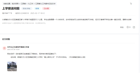 關于反映九江市濂溪區朗鏡東方小區距離所劃分的小學路程較遠,學生上學不便的問題。經濂溪區委核辦,2025年5月,已開通朗境東方小區至濂溪區第三小學的“愛心家校公交”,切實解決學生上下學的出行難題。