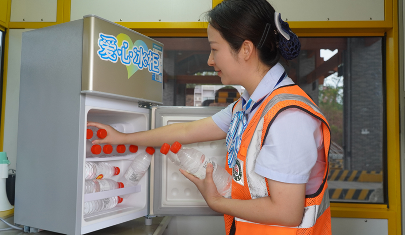 贛州北站工作人員為愛心冰柜補充飲用水。李存婷攝
