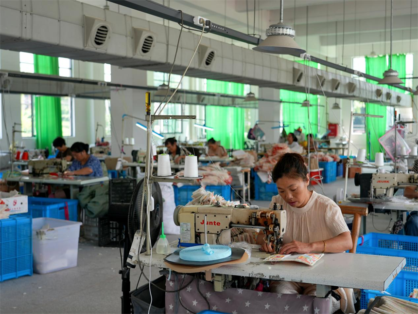 在村口顯著位置,有一家3層樓的幫扶車間,下午2點,村民們陸續開始”上班“。