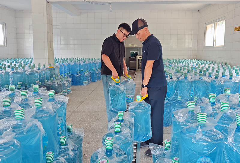 工人在倉庫協作搬運桶裝水。江麗蓉攝