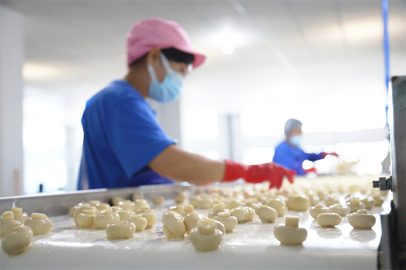 在生產車間內,工人正在生產加工雙孢菇。邱志超攝