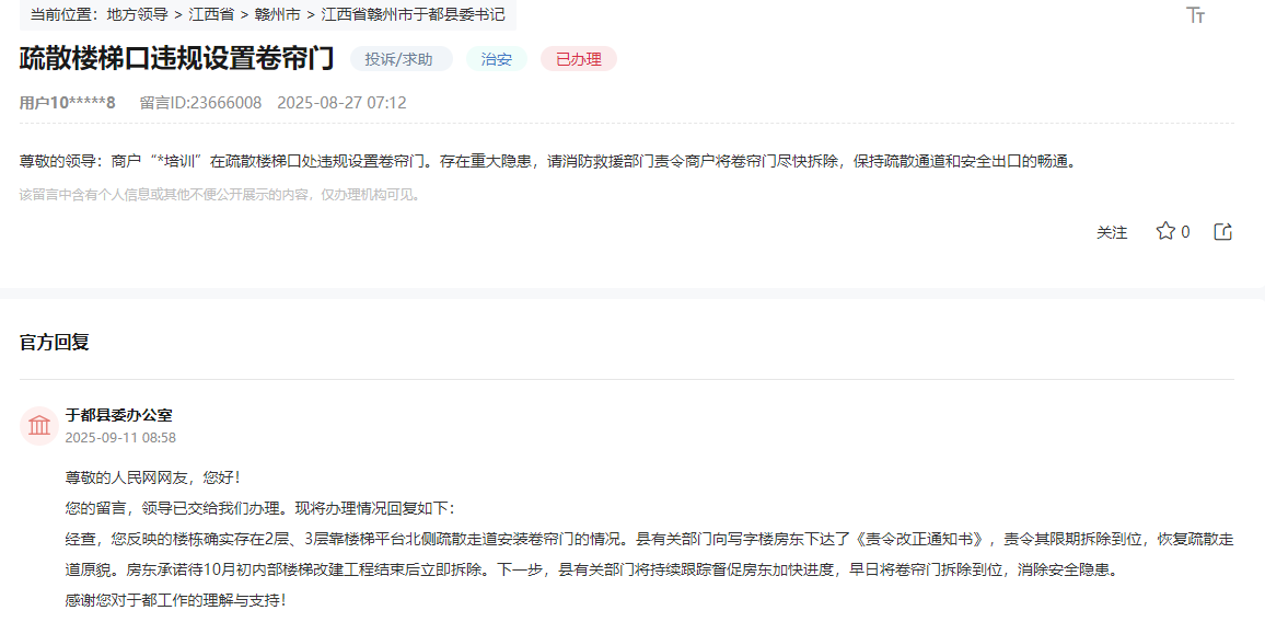 收到網友留言后,于都縣委辦公室進行了回復。 經查,網友反映的樓棟確實存在2層、3層靠樓梯平臺北側疏散走道安裝卷簾門的情況??h有關部門向寫字樓房東下達了《責令改正通知書》,責令其限期拆除到位,恢復疏散走道原貌。