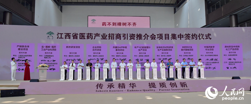 大會開幕現場,還舉辦了江西省醫藥產業招商引資推介會,10個項目現場簽約。人民網記者 時雨攝