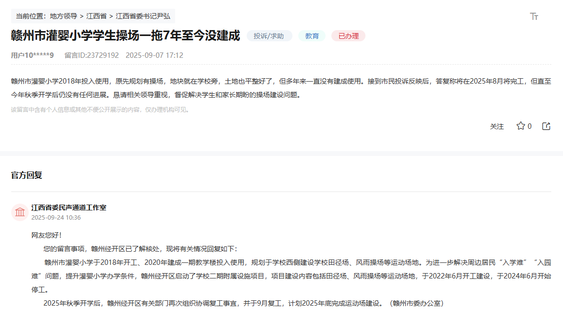 關于反映贛州市灌嬰小學投用多年,校內田徑場、風雨操場等運動場地仍未完工啟用的問題。經贛州經開區黨工委核辦,已組織協調學校二期附屬設施項目復工,預計2025年底完成運動場地建設。