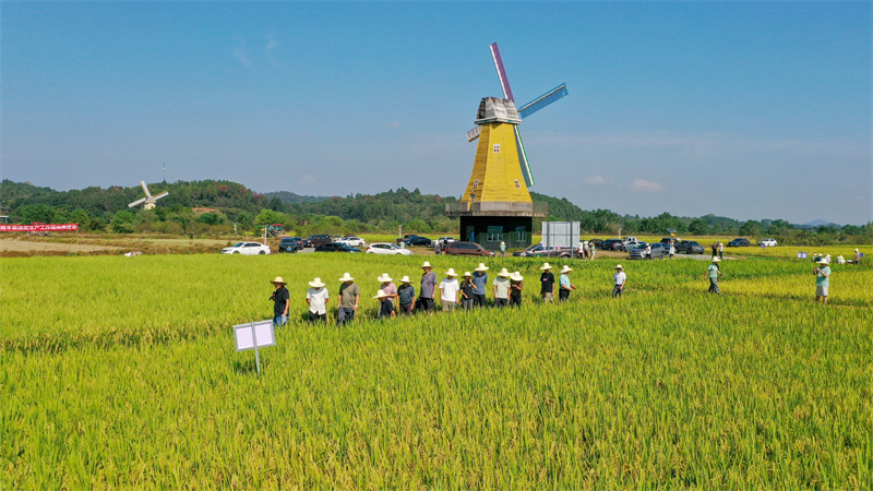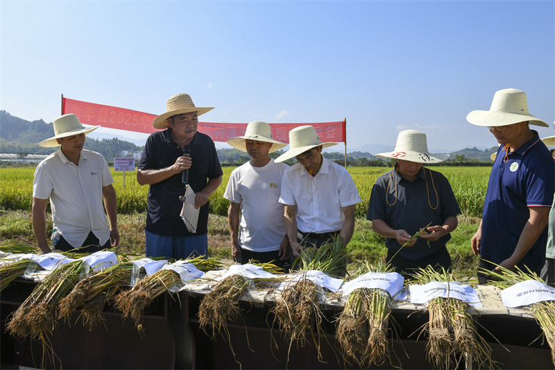農業專家和參會人員對晚稻品種進行篩選評比。鄧鵬攝