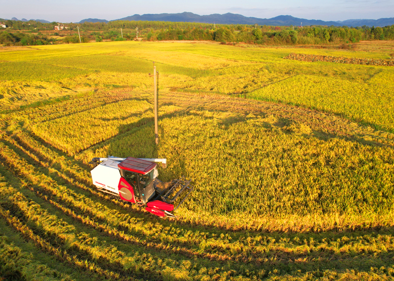 2025年10月25日,廣昌縣頭陂鎮山下村數千畝稻田漸入金黃,金燦燦的稻田與鄉村勾勒出一幅美麗鄉村豐收畫卷,收割機在田間往來回穿梭。割稻、脫粒、收谷、入倉……當地農事服務中心提前部署一批農機手作業收割,同時利用現代化烘干設備抓緊烘糧,確保全縣秋糧應收盡收、顆粒歸倉。